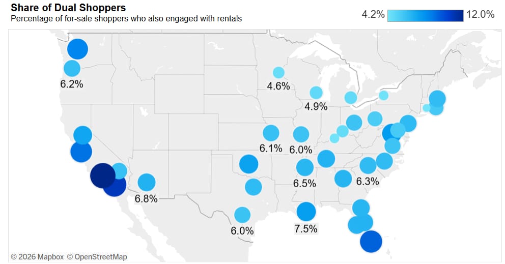 Zillow just gave us the clearest portrait yet of what affordability pressure actually looks like in practice: 8% of buyers toggling between "buy" and "rent" tabs because the monthly math doesn't work for either option. They want three bedrooms. They'll take 284 fewer square feet. They won't compromise on the room count. In LA, one in eight buyers is dual shopping.