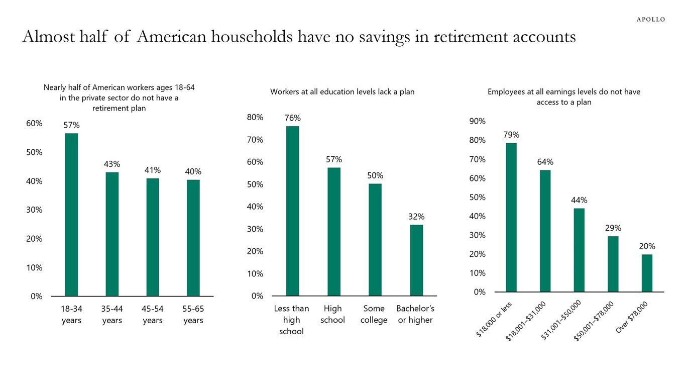 Apollo's chart shows half of working-age America has no retirement savings. What it doesn't show is that the other half's retirement plan is mostly their house - boomers hold $19 trillion in home equity and a median of just $40,000 in actual retirement accounts. That's why they won't sell, why inventory stays frozen, and why the "silver tsunami" keeps getting postponed.