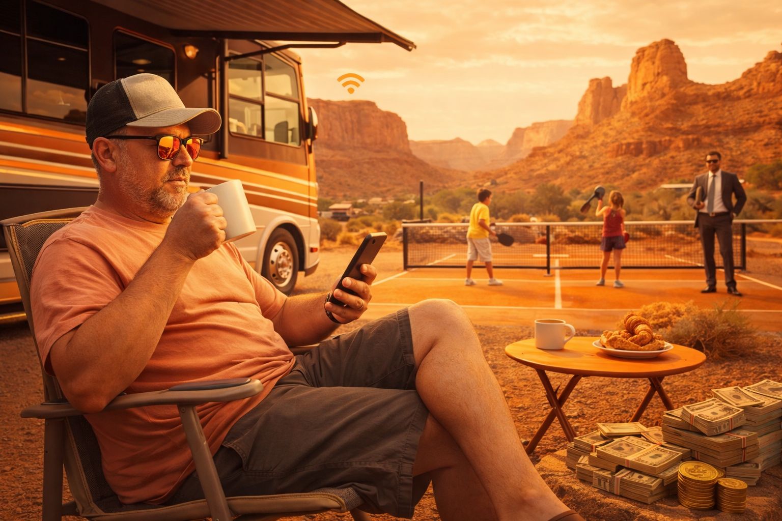Somewhere in Moab, Utah, a 42-year-old private equity analyst is sipping craft coffee outside his $180,000 motorhome, scrolling Slack on campground wi-fi, while his kids play pickleball fifty yards away. His father, who camped in a canvas tent held together by optimism and duct tape, would not recognize this version of "roughing it."